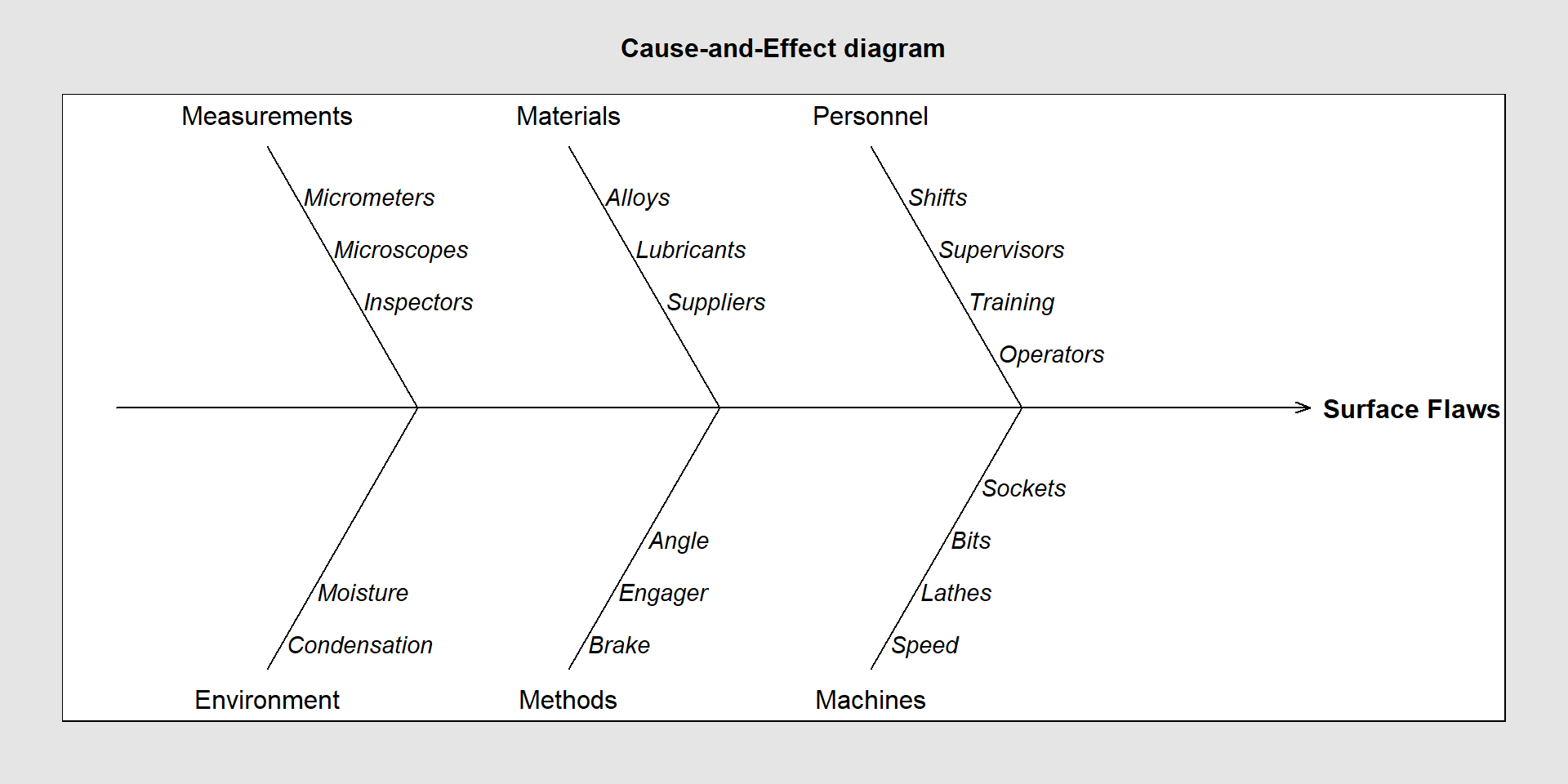 cause.and.effect(cause=list(Measurements=c("Micrometers", "Microscopes", "Inspectors"),