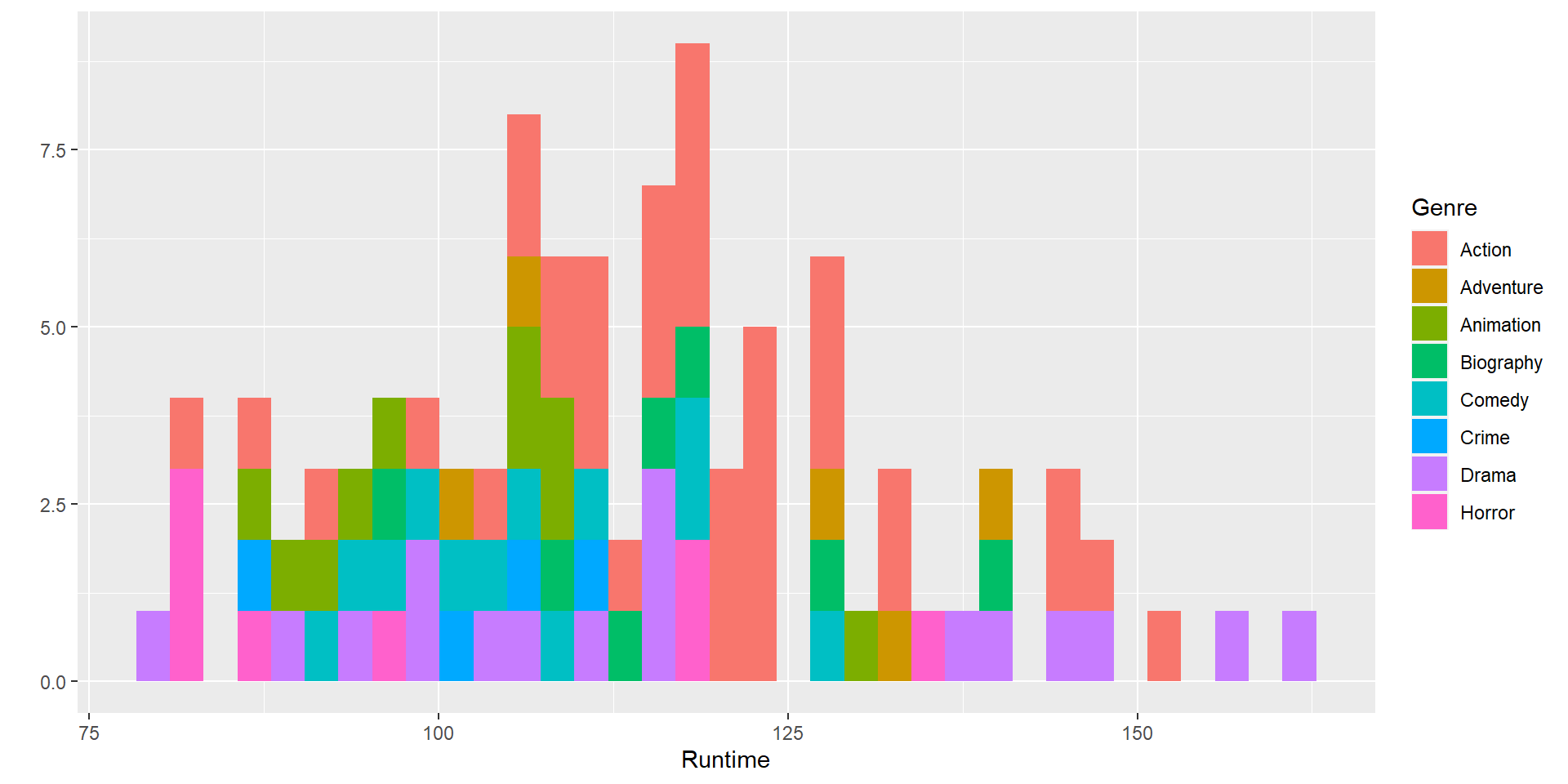 Draw a histogram to show the Runtime according to the variable Genre using ggplot2.