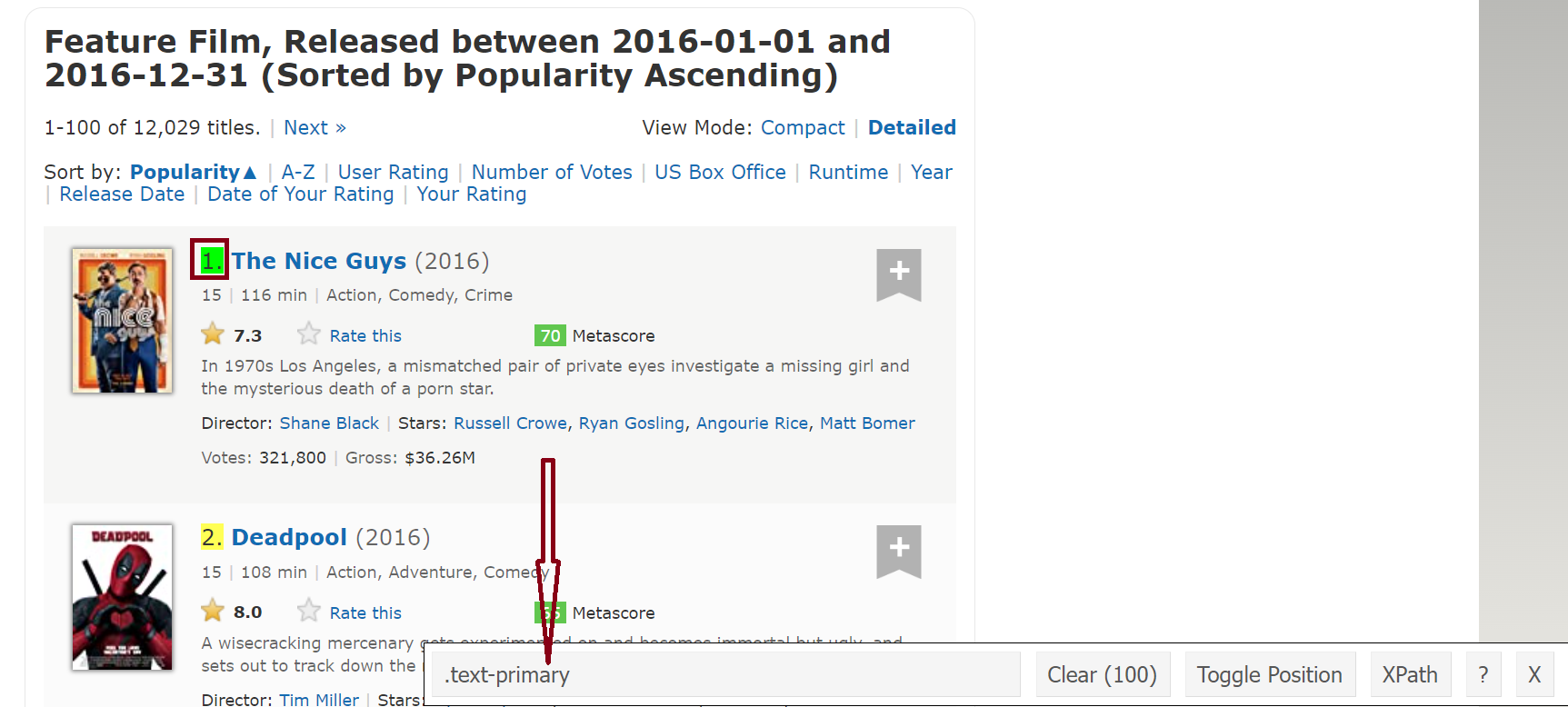 The 100 most popular feature films released in 2016 are given in IMDb website (https://www.imdb.com/search/title/?count=100&release_date=2016,2016&title_type=feature). To scrape the data in this site, we use the commonly used web Scraping package in R, i.e. rvest, which is one of the tidyverse packages introduced by Hadley Wickham.