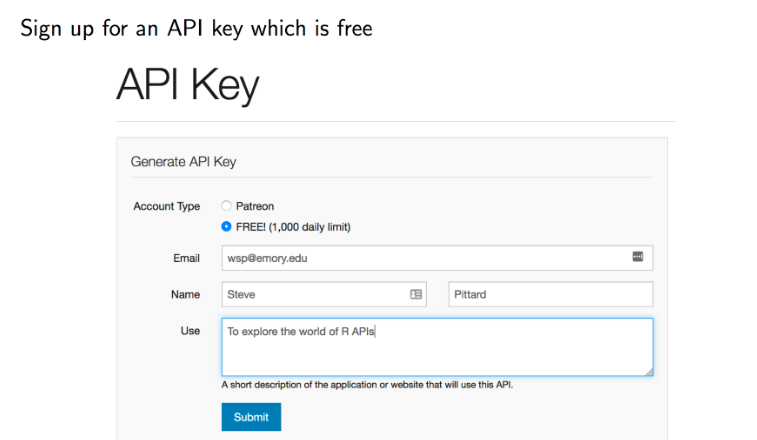 Here we use API of IMDB website (https://www.omdbapi.com/). First, sign up for an API key.