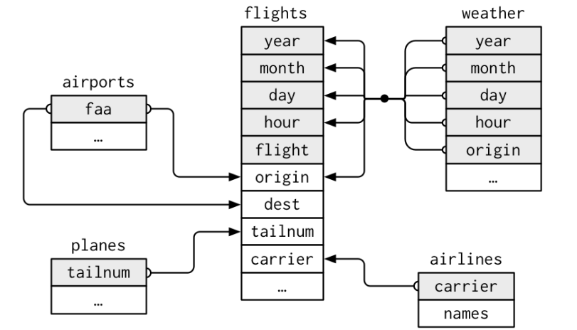 # Check variables in each tibblelibrary(tidyverse)library(nycflights13)flightsairlinesairportsplanesweather